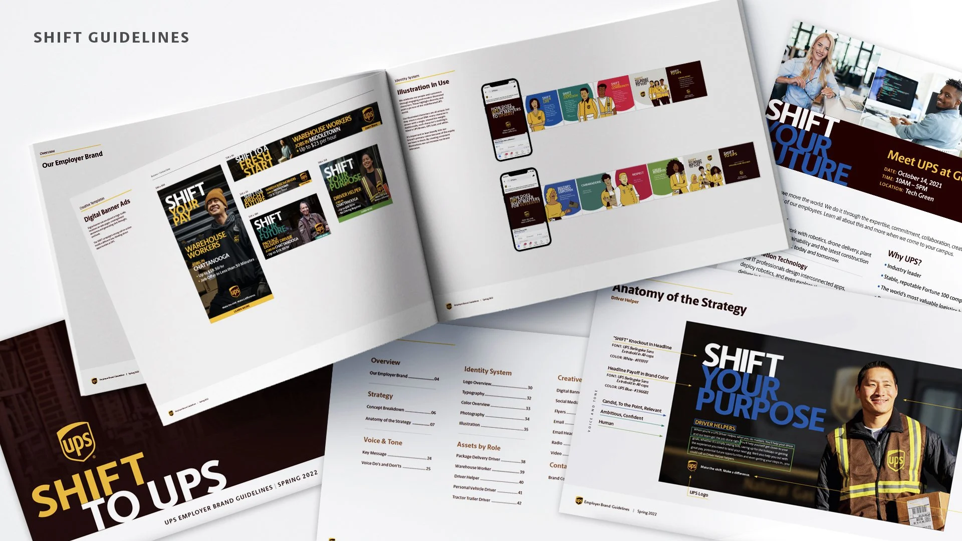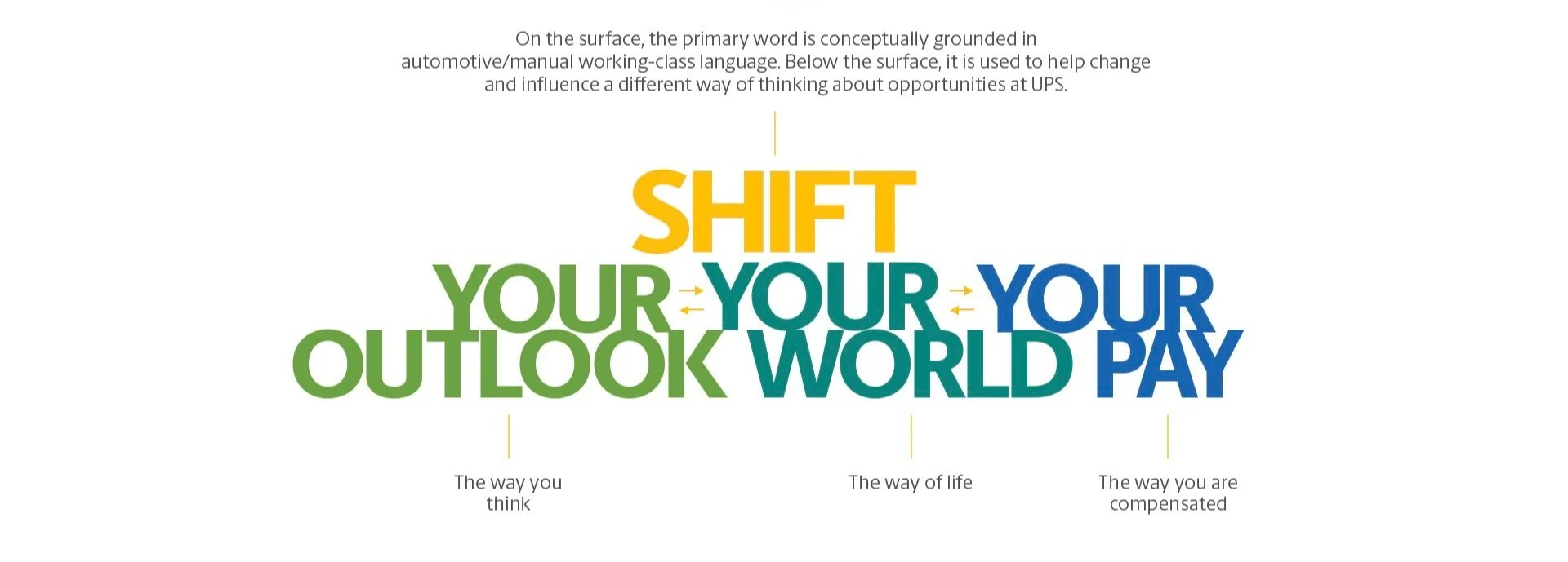Created a new employer brand for UPS “Shift to UPS”. On the surface, the primary word, shift, is conceptually grounded in automotive/manual working class language. Below the surface, it is used to help change and influence a different way thinking about opportunities at UPS.